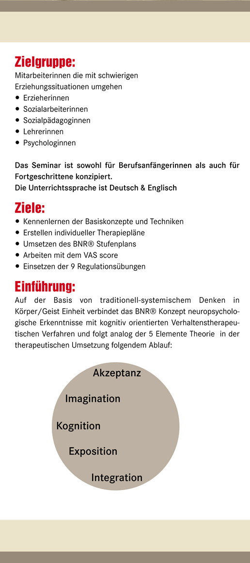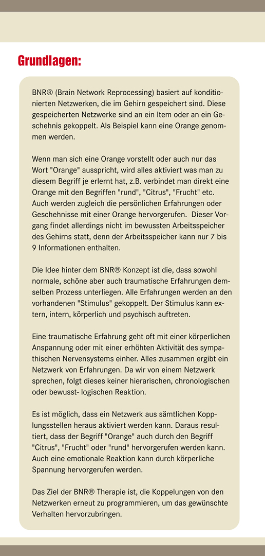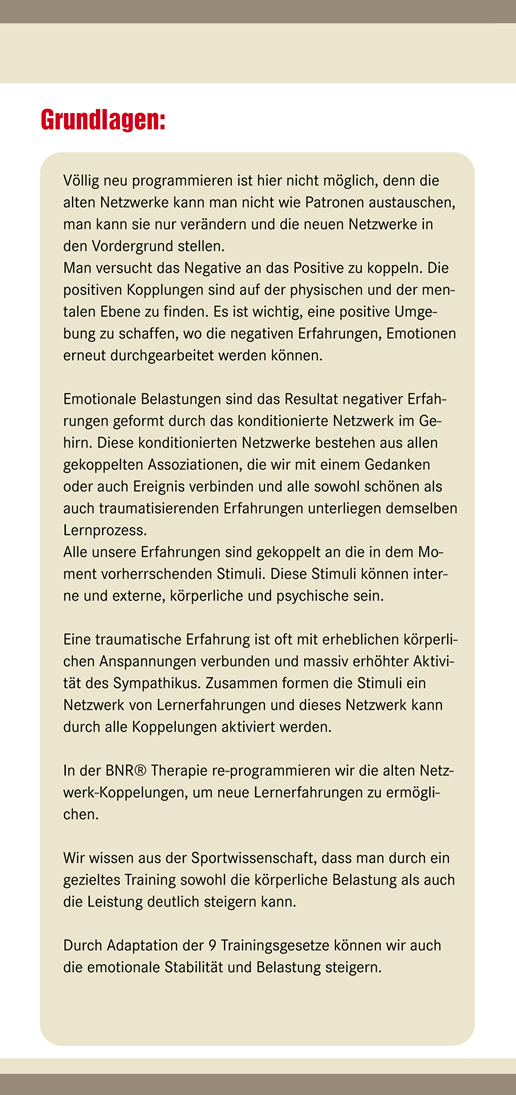 Auf der Basis von traditionell-systemischem Denken in Körper/Geist Einheit verbindet das BNR® Konzept sowohl neuropsychologische Erkenntnisse mit kognitiv orientierten verhaltenstherapeutischen Verfahren als auch körperorientierte Verfahren analog den 9 Trainingsgesetzen.